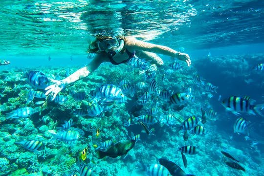 Following your transfer, start by sailing the turquoise waters on board a comfortable boat. Marvel at views of the white sand beaches and palm-thatched beach huts. Soak up the Red Sea sun, watching for playful dolphins as you go. Then, upon arrival at Mahmya, you are free to snorkel the impressive coral heads of the clear lagoon. Relax on the beach and swim in crystal clear waters.